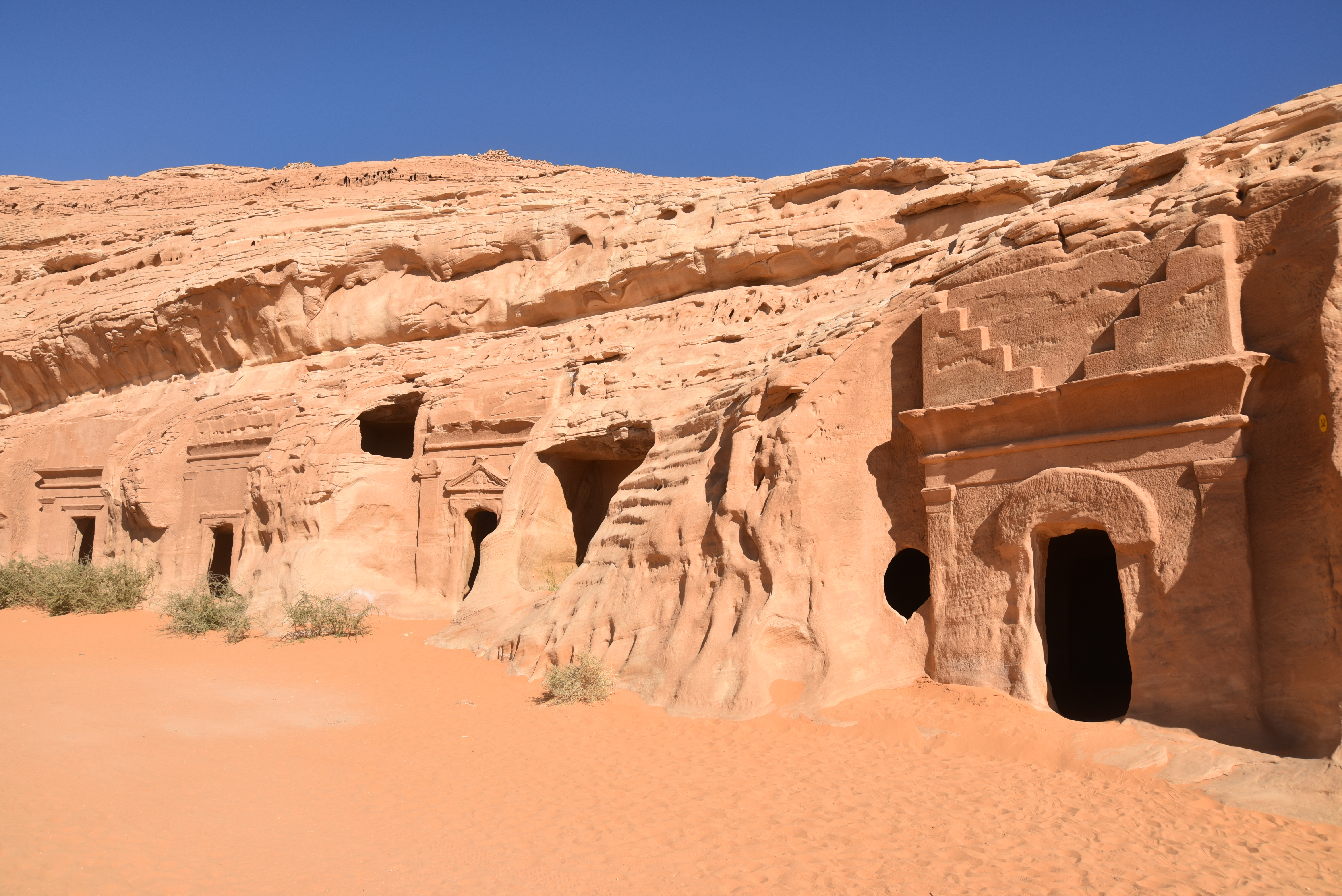 The Qasr al-Bint necropolis in Hegra (Mada'in Salih) in modern-day Saudi Arabia is one of the four necropolis areas to have survived. Qasr al-Bint consists of 31 Nabatean tombs dating from 1 to 58 CE. The tombs include fine inscriptions concerning the eminent figures for whom the tombs were intended and decorations such as birds, monsters and human faces.