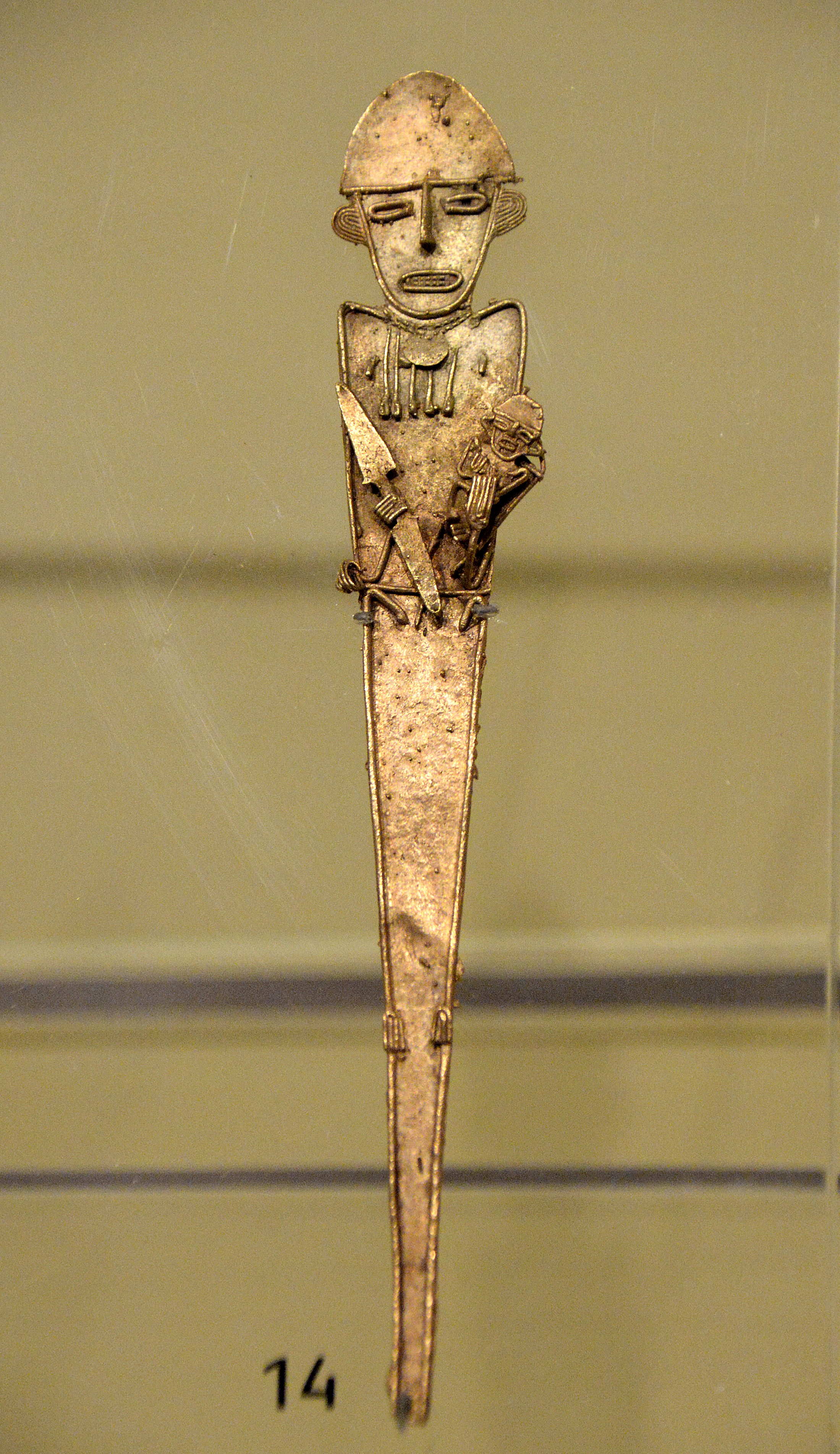 A female figurine holding a small child on her chest and a dagger in her right hand. A material of religious significance, the flat gold figures (or Tunjos), were votive offerings left in caves or lakes. They were rarely found inside tombs. Pre-Columbian gold was first associated with the elite but became widely accessible later. From the Muisca civilization, Colombia, 10th to 16th century.