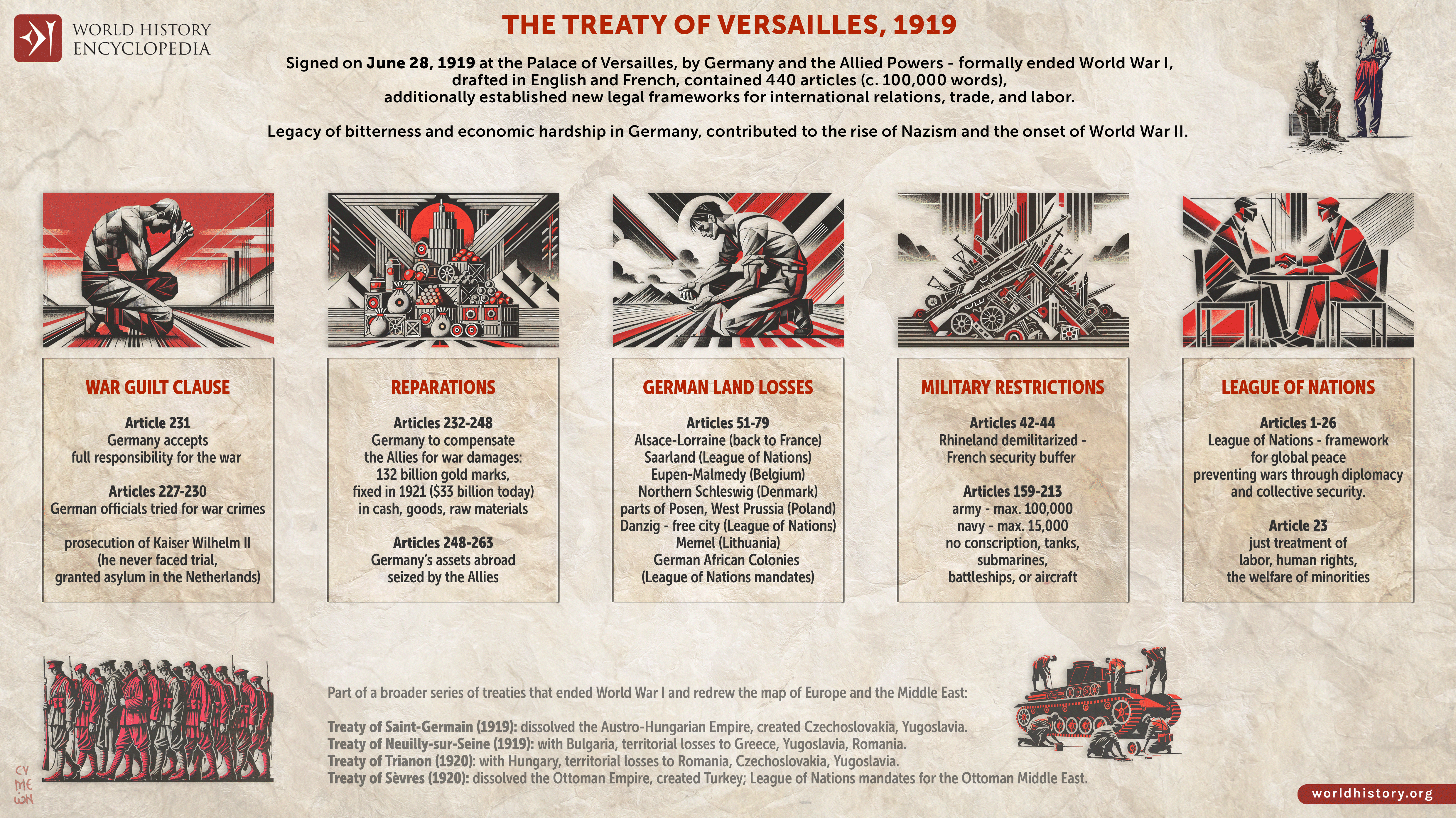 An infographic illustrating the Treaty of Versailles siigned on 28 June, 1919. The treaty, following the armistice of 11 November 1918, formally ended the First World War and imposed severe territorial, military, and financial penalties on Germany, including the loss of key territories, military restrictions and the requirement to pay heavy reparations. It also included the War Guilt Clause, which held Germany responsible for the war. The treaty established the League of Nations, aimed at preventing future conflicts, but its punitive terms contributed to future unrest in Europe.