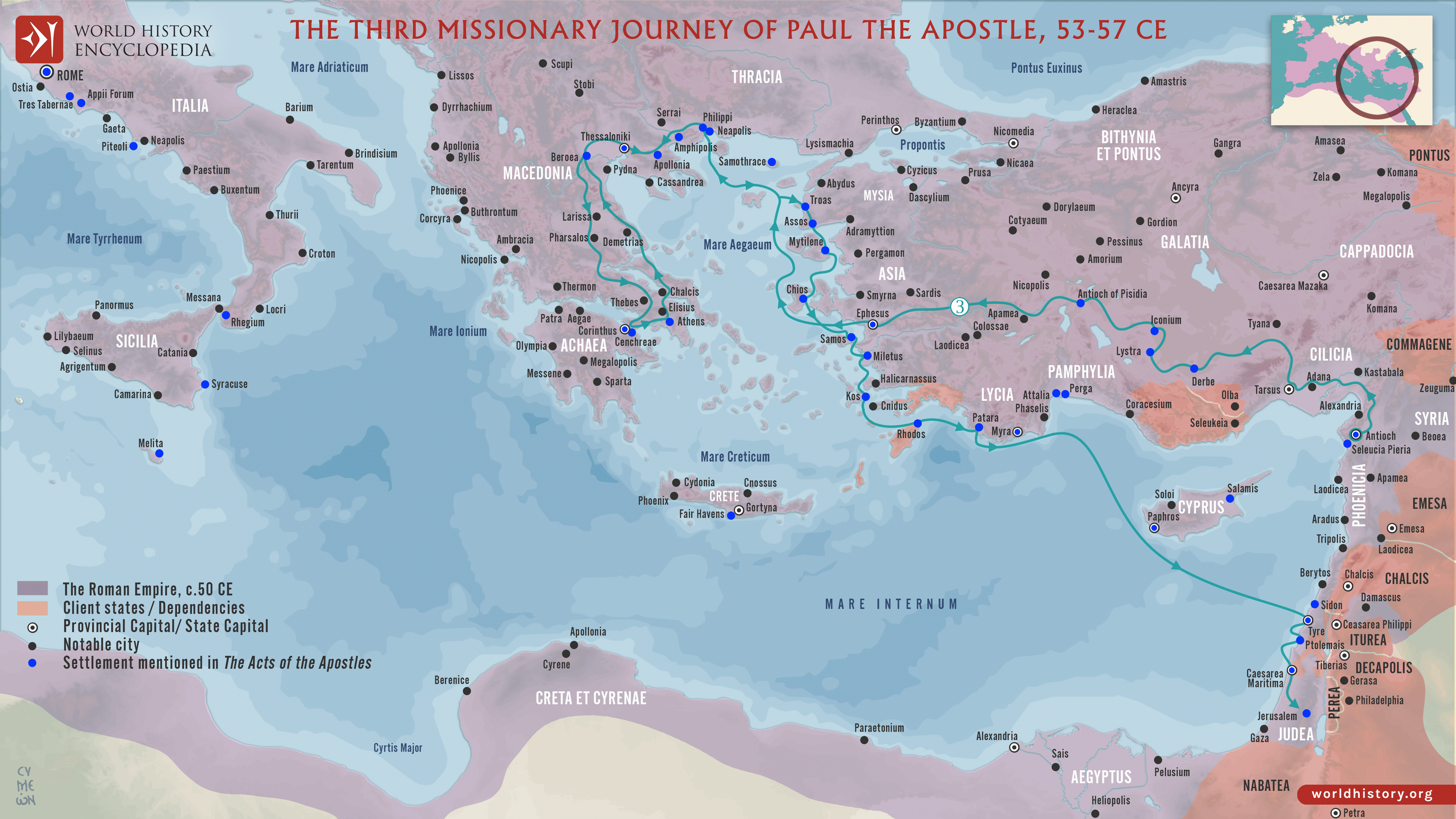 Netchev, S. (2024, July 16). Paul the Apostle's Third Missionary Journey (c. 53-57 CE). World History Encyclopedia. Retrieved from https://www.worldhistory.org/image/19234/paul-the-apostles-third-missionary-journey-c-53-57/
